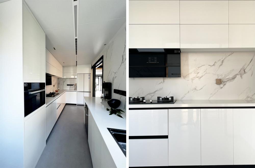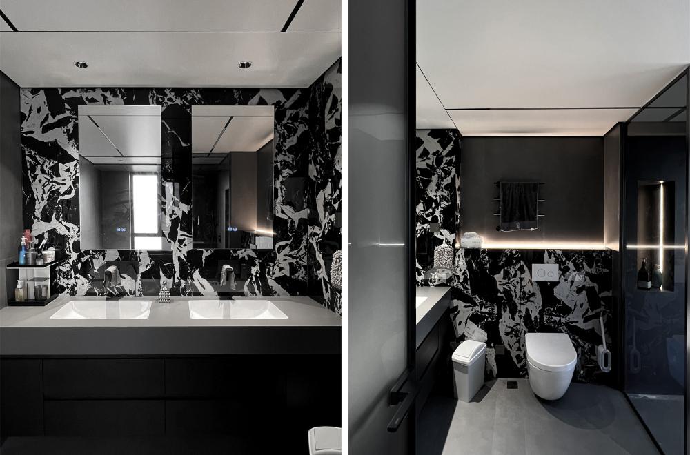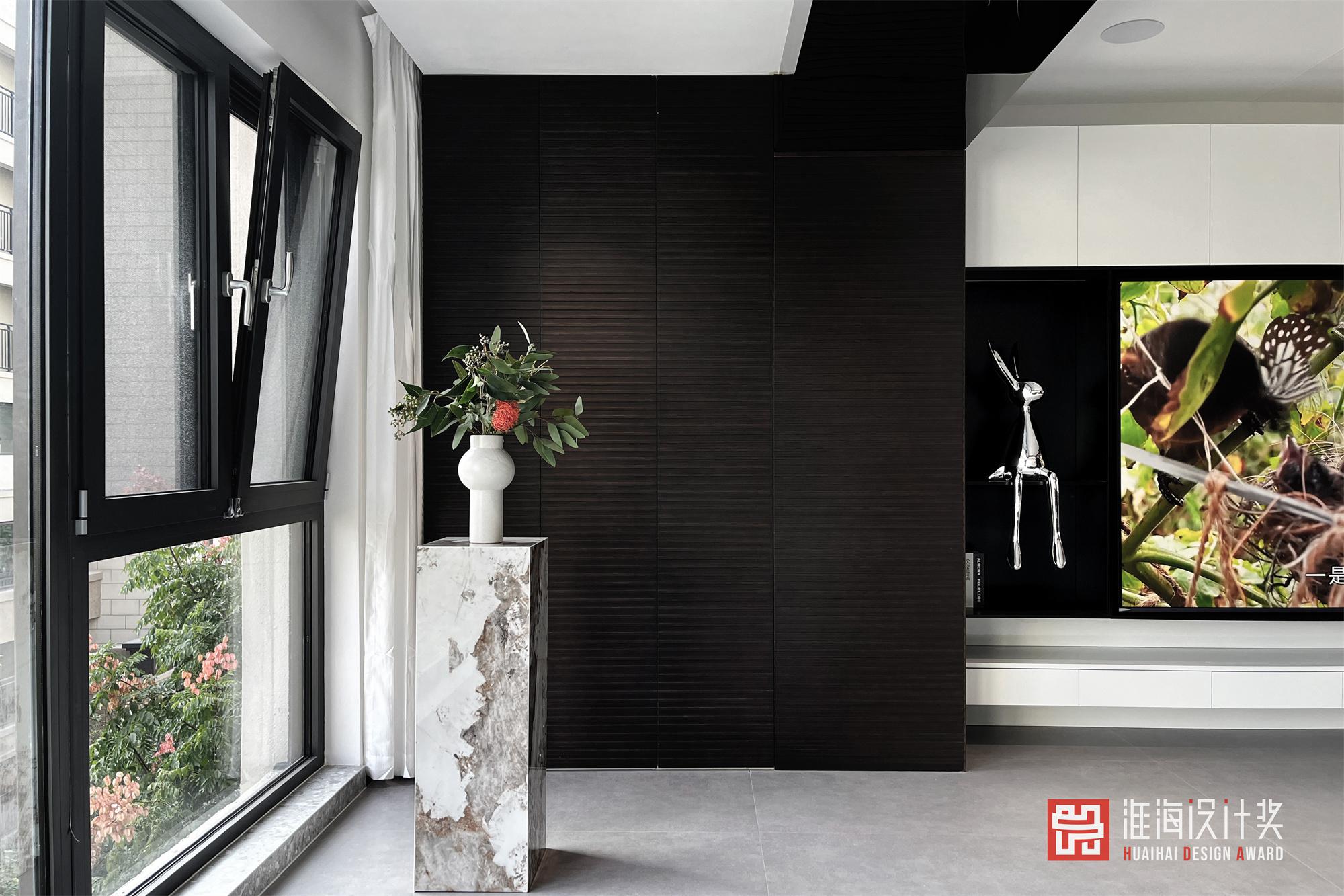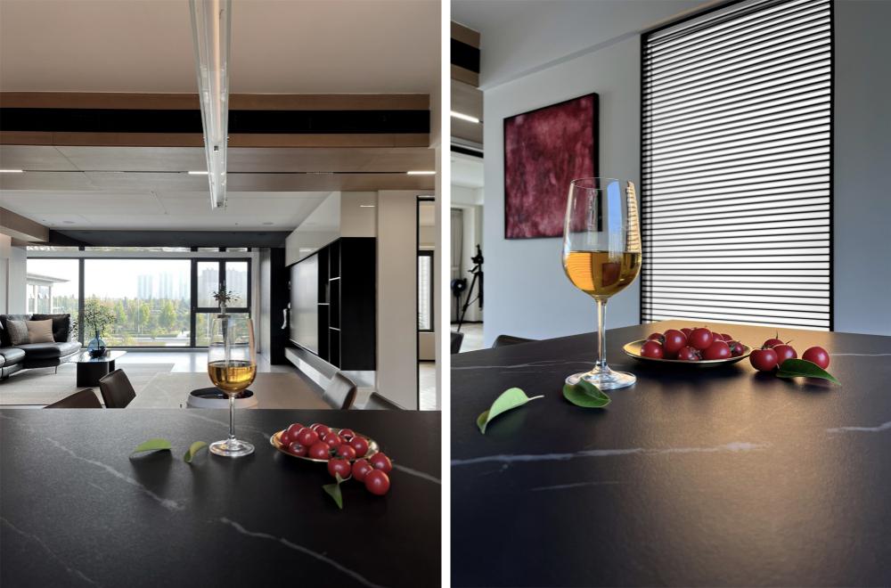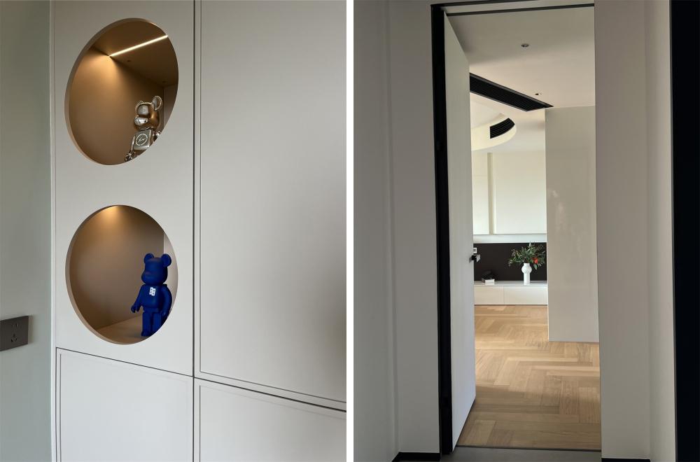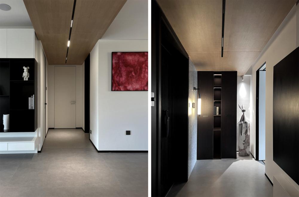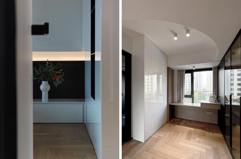 如果只会照搬「黑白灰」色系来处理设计风格,那么极有可能会“撞风格”。基于屋主的居住习惯及审美为标准才能打造出设计的专属感。了解到屋内常住人口三口,首当其冲的即是预留收纳储藏功能.既要清爽不累赘又要能装且实用性高。