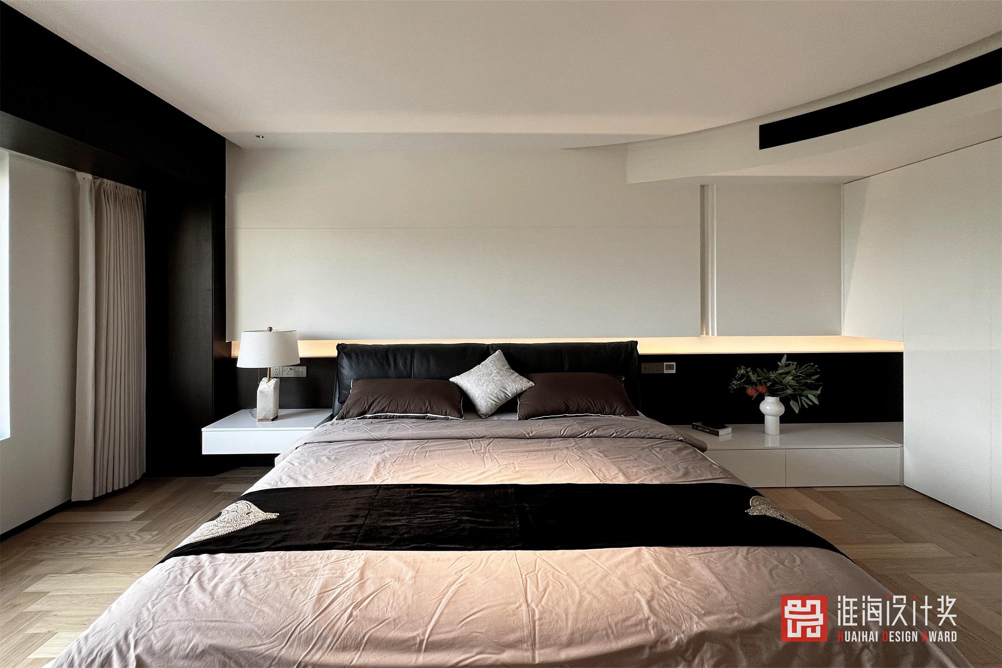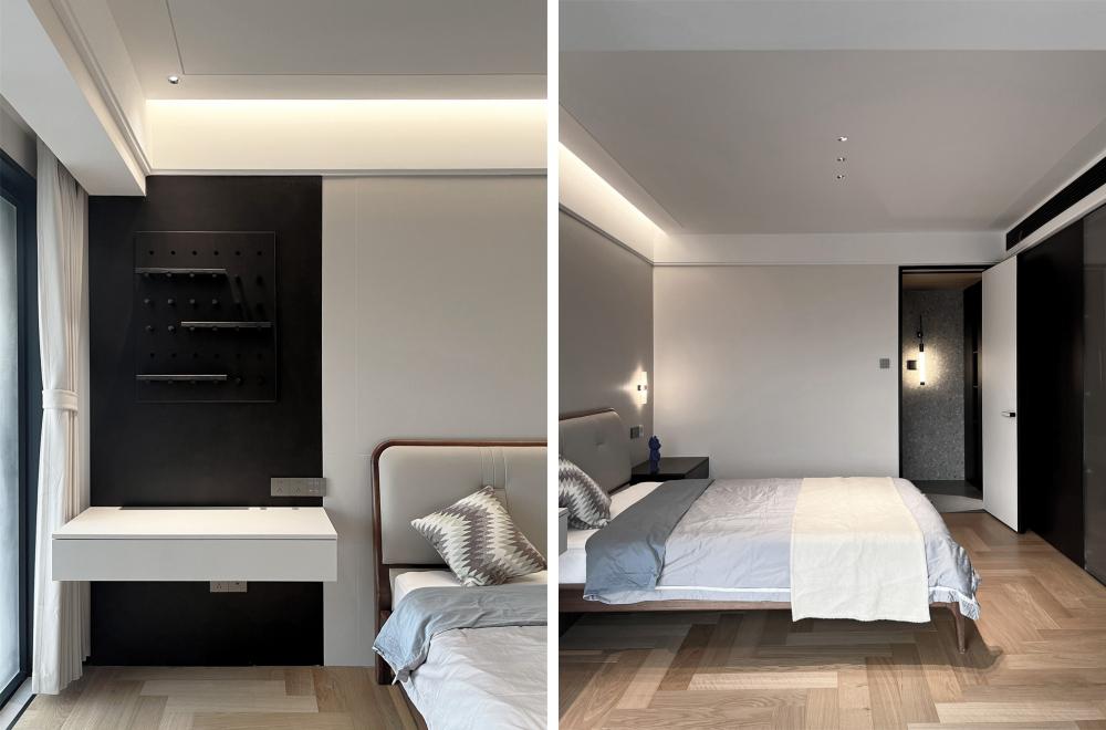 主卧顶面也用了很多弧形元素,极简里面带一些柔和,整体线条干净利落,层次多样,丰富而协调。